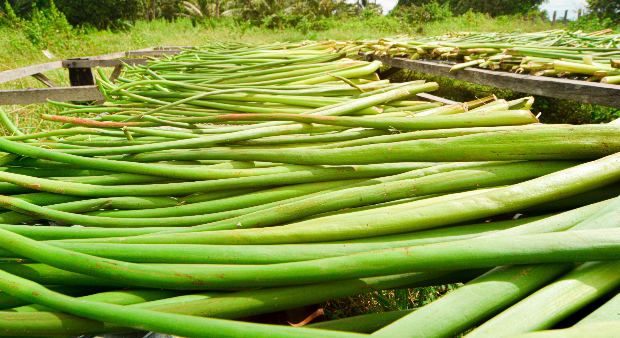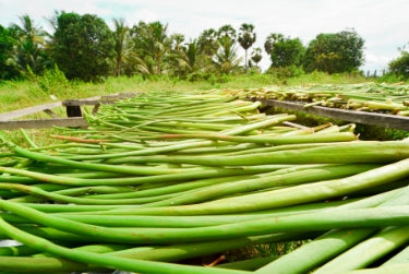 湖から刈り取った水草を丁寧に天日干しして、一束一束手洗いします。
